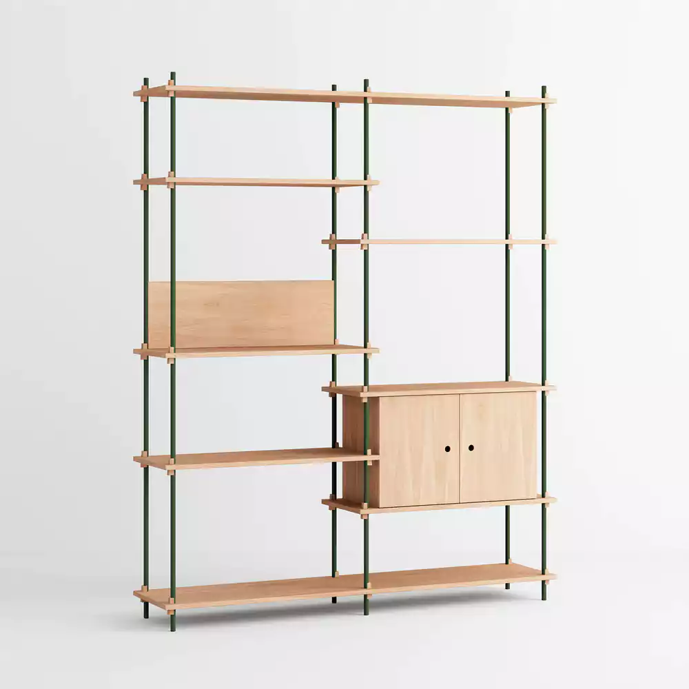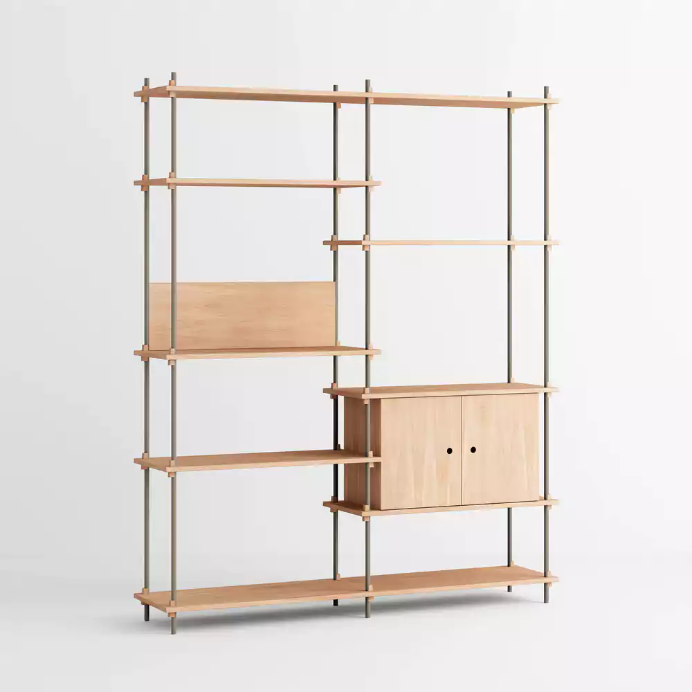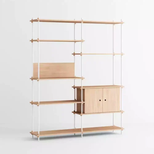 Het modulaire Moebe Shelving System geeft je volledige vrijheid om je eigen kast te bouwen. Bouw zo hoog en breed als je wilt, om hoeken heen of over verschillende niveaus. De legplanken worden bevestigd met massief eikenhouten wiggen op eigen gewenste hoogtes.