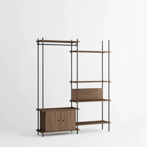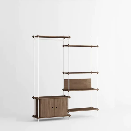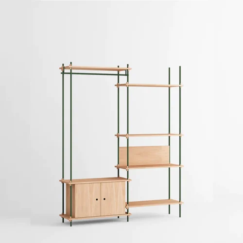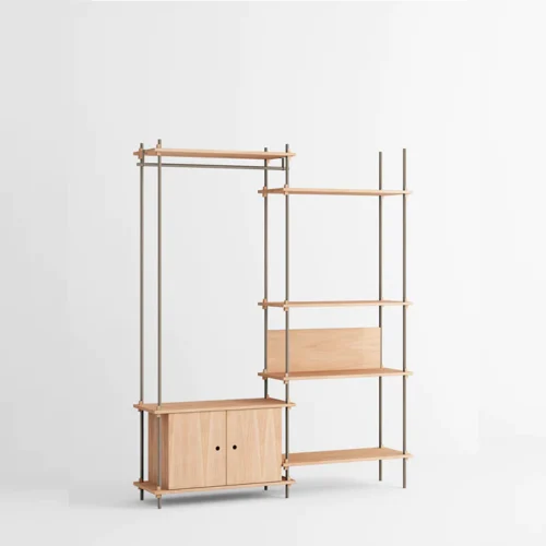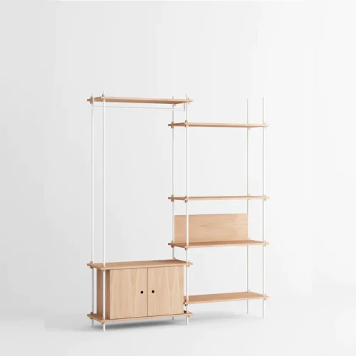 Het modulaire Moebe Shelving System geeft je volledige vrijheid om je eigen kast te bouwen. Bouw zo hoog en breed als je wilt, om hoeken heen of over verschillende niveaus. De legplanken worden bevestigd met massief eikenhouten wiggen op eigen gewenste hoogtes.