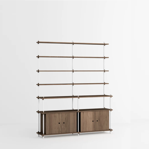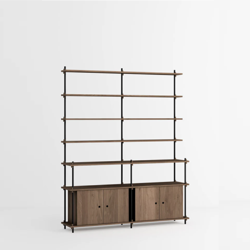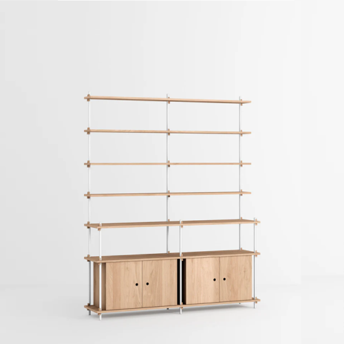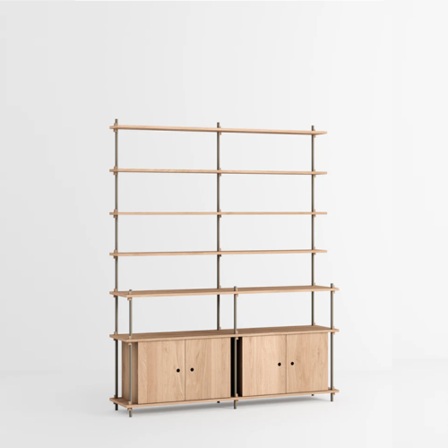 Het modulaire Moebe Shelving System geeft je volledige vrijheid om je eigen kast te bouwen. Bouw zo hoog en breed als je wilt, om hoeken heen of over verschillende niveaus. De legplanken worden bevestigd met massief eikenhouten wiggen op eigen gewenste hoogtes.