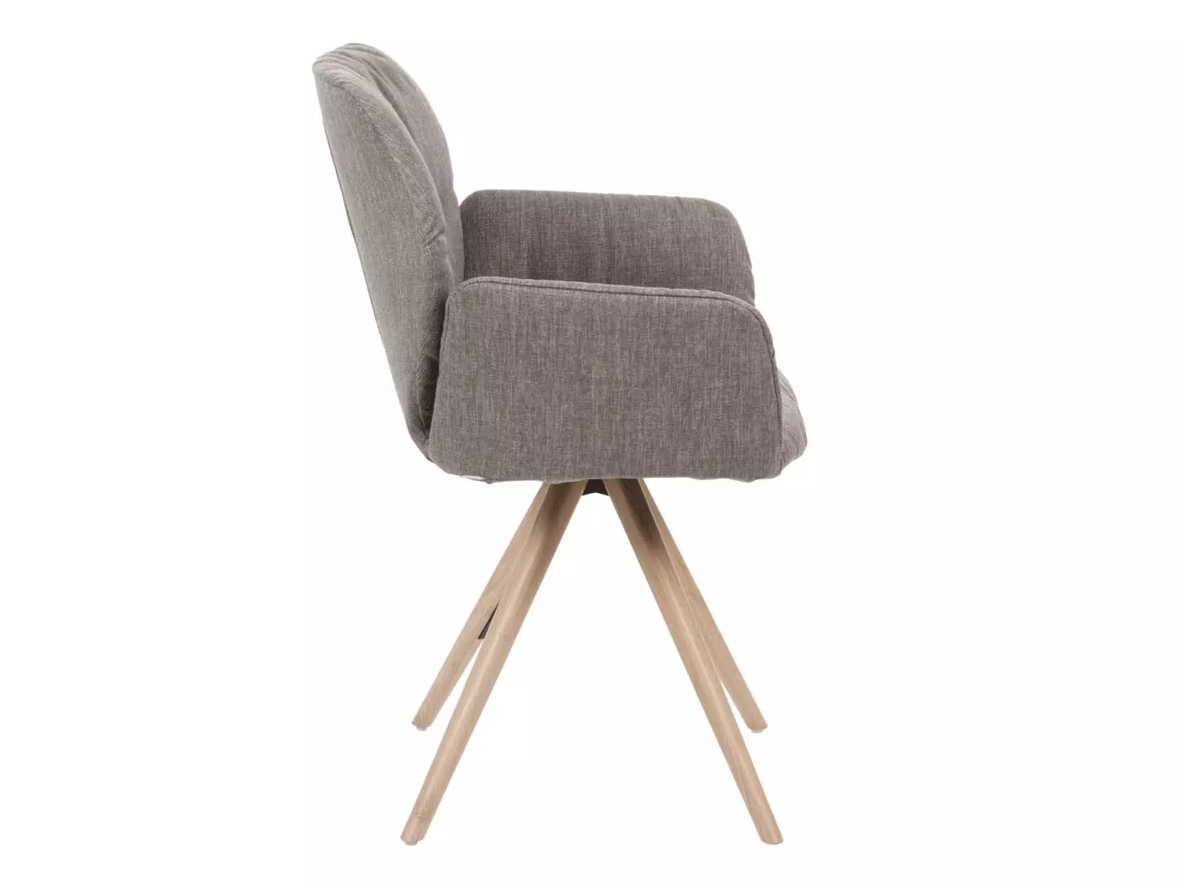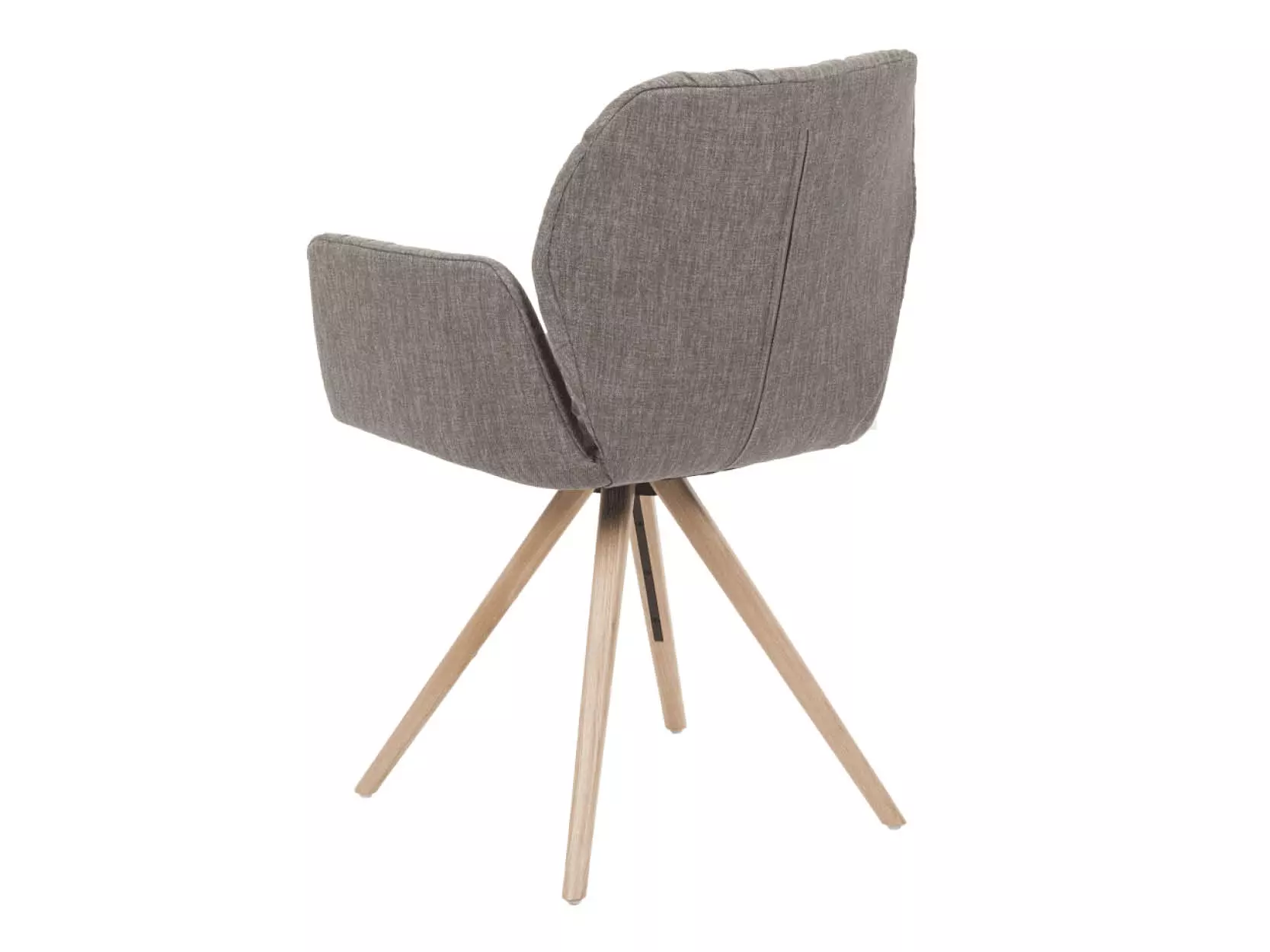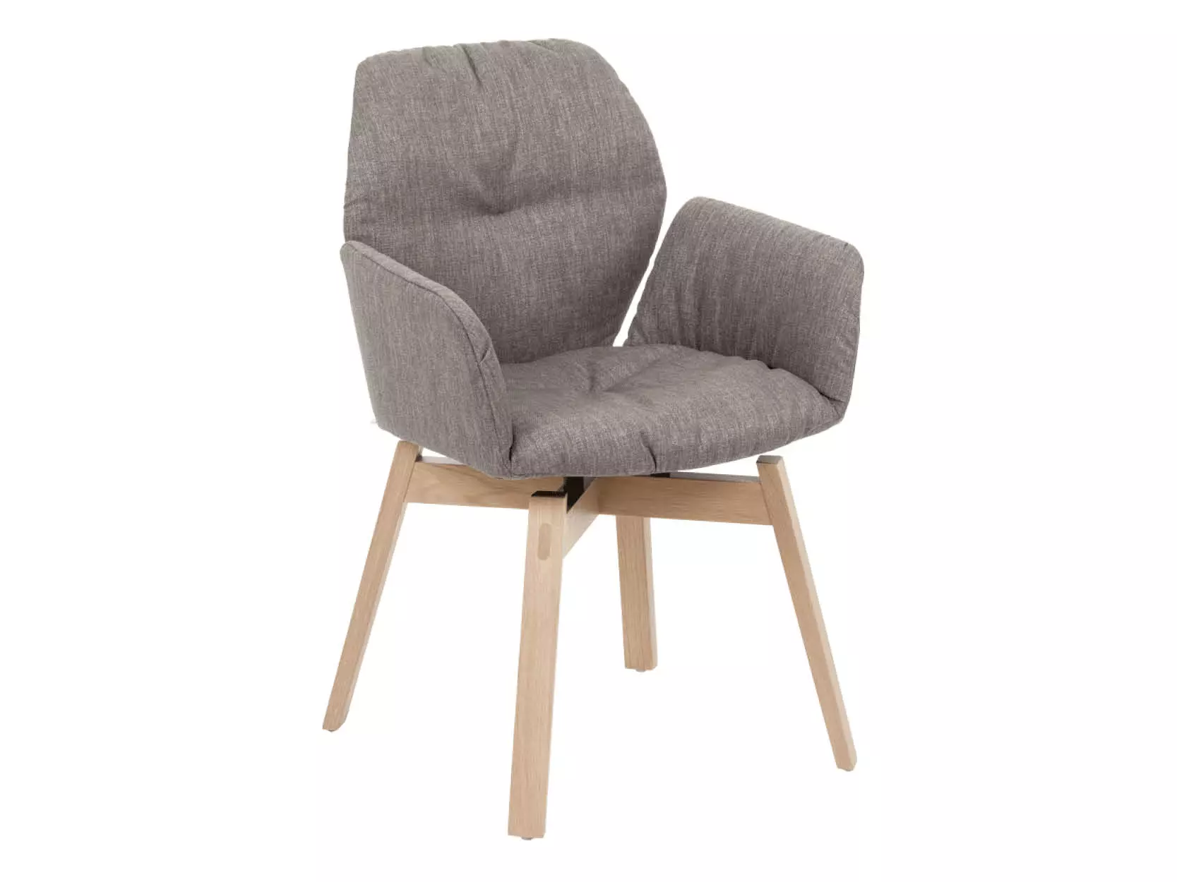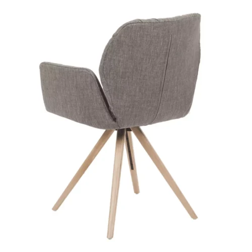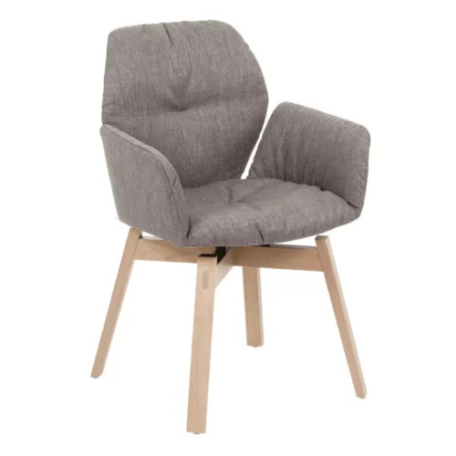 De stoel met armleuning is verkrijgbaar met houten onderstellen in eiken of noten, afgewerkt in verschillende tinten, en leverbaar als vaste uitvoering of met draaifunctie en auto-return.