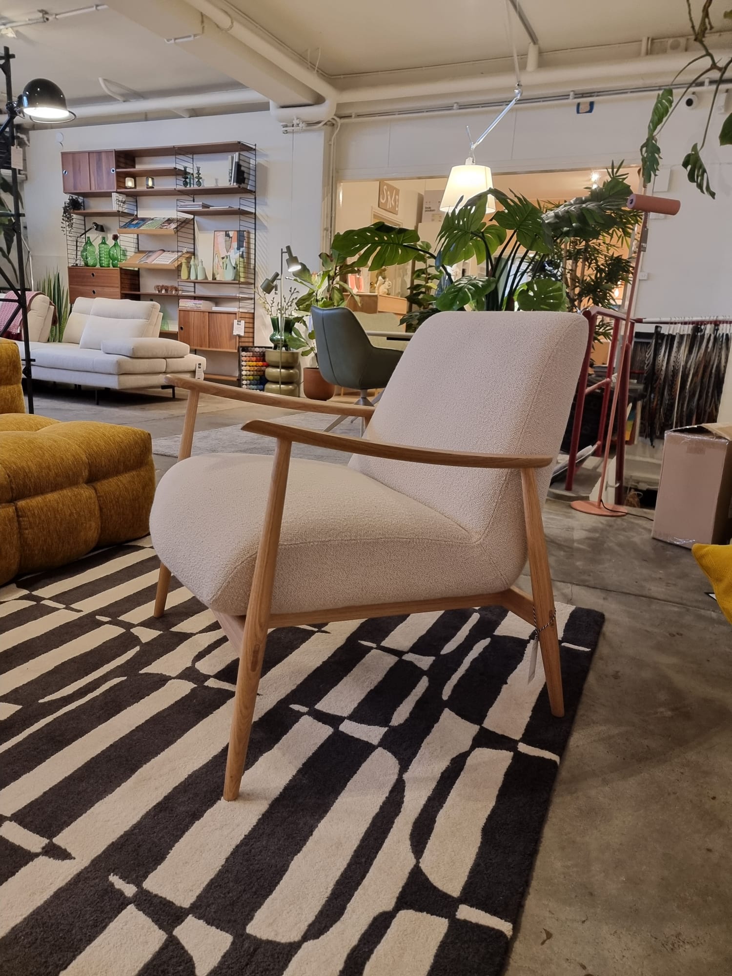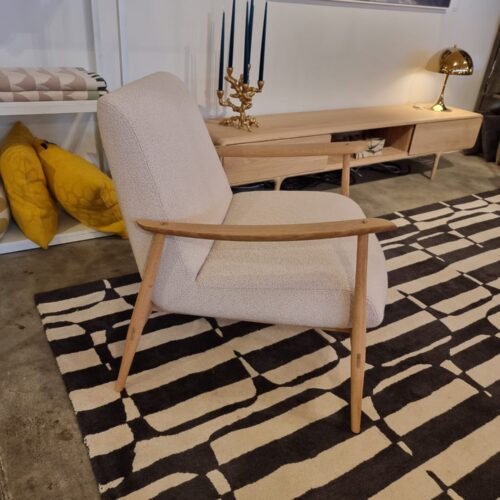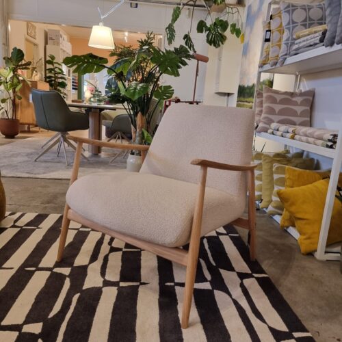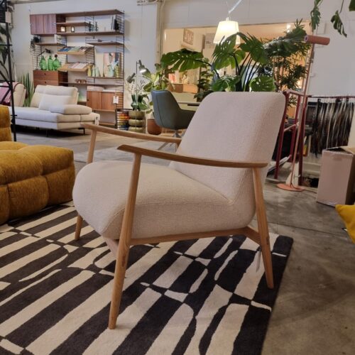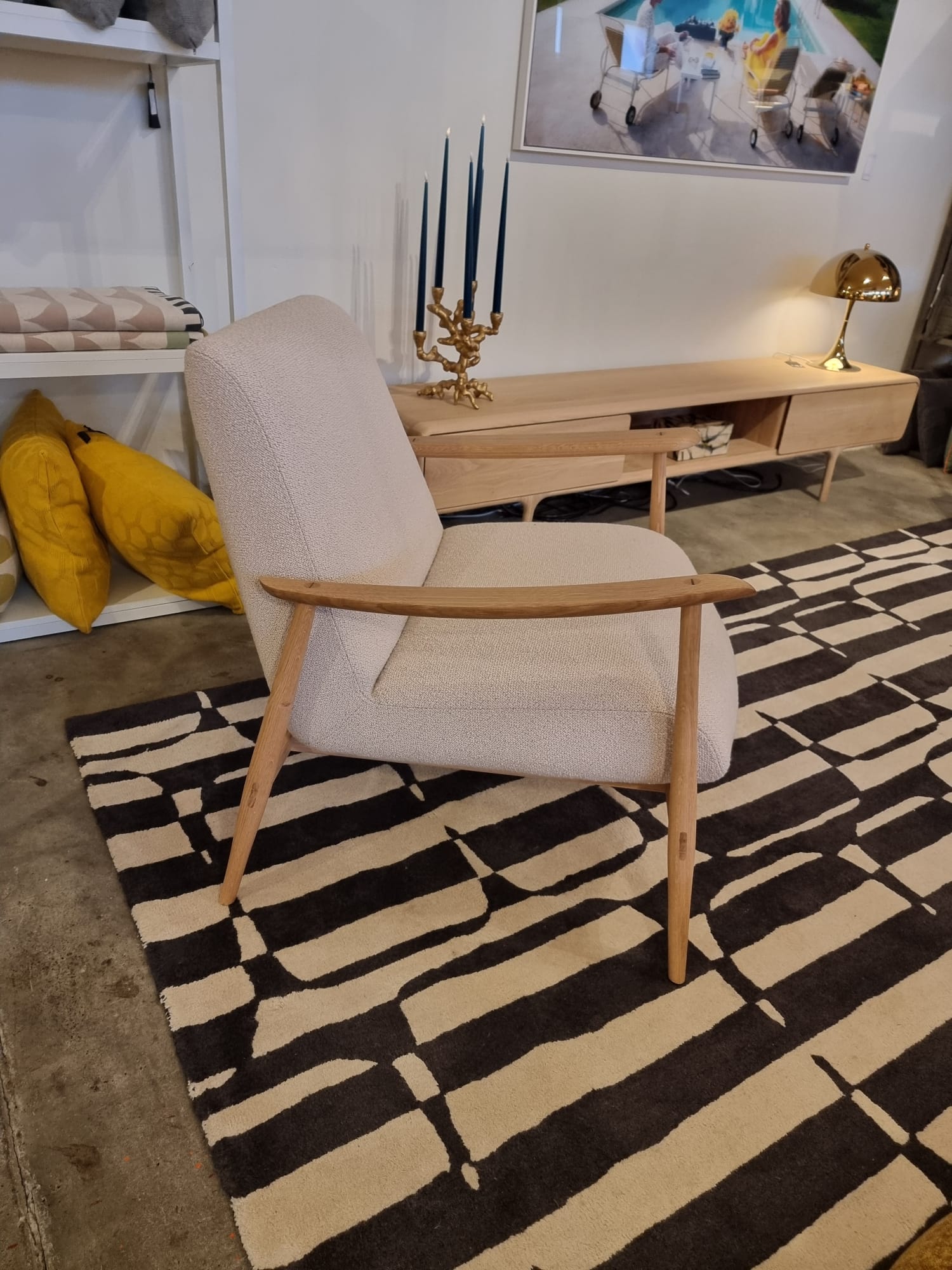 De fauteuil is gestoffeerd met een witte, wollige stof en heeft een massief eikenhouten onderstel.